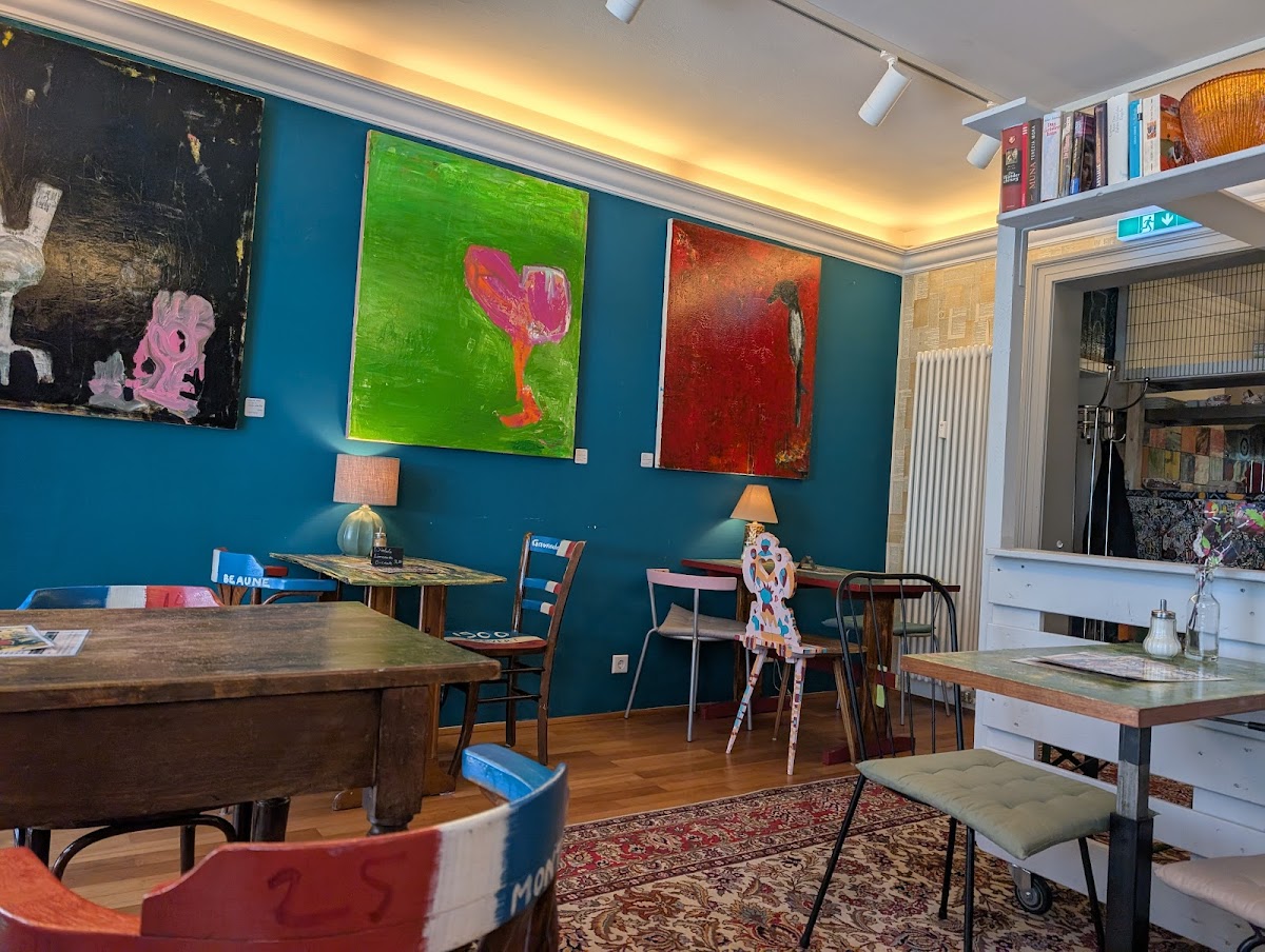 The moment you step inside, you're greeted by an intimate ambiance enriched by a curated selection of exhibited artworks. The charming interior, complemented by quaint furnishings, makes every corner a feast for the eyes. You can bask in the soft melodies of French chansons that waft through the air, enhancing your experience as you sip on a delightful beverage.